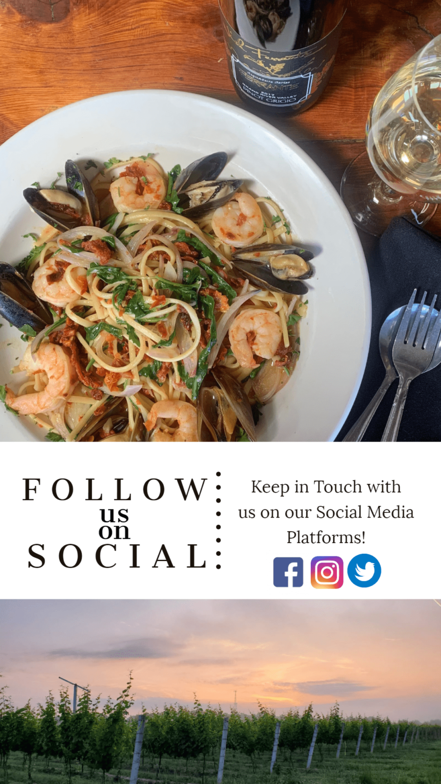 Follow us on Instagram, Facebook & Twitter!! Get behind the scene information on the winery, restaurant features, wine specials, wine savings and so much more!